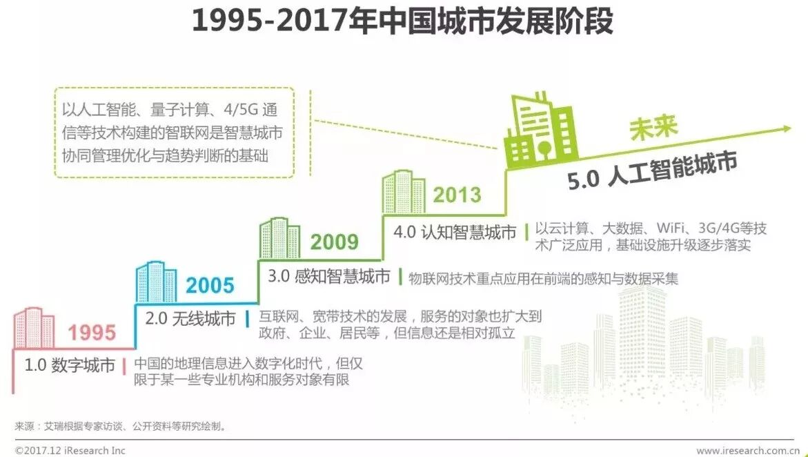 早在90年代,IBM首次提出“智慧城市”概念后,中國也在1995年啟動數字城市建設,這是中國智慧城市的1.0版本;隨著2008年“智慧地球”概念的提出,中國智慧城市建設再次進入到3.0感知智慧城市時代;在2013年,WiFi、3G/4G的網絡傳輸與云計算、大數據的后端數據存儲、處理與分析的技術進步下,開啟了4.0認知智慧城市時代;在不久的將來,數據積累以及傳輸帶寬和速度的再次騰飛,使得智慧城市達到整體架構協同管理,“人工智能城市”的時代也將到來。