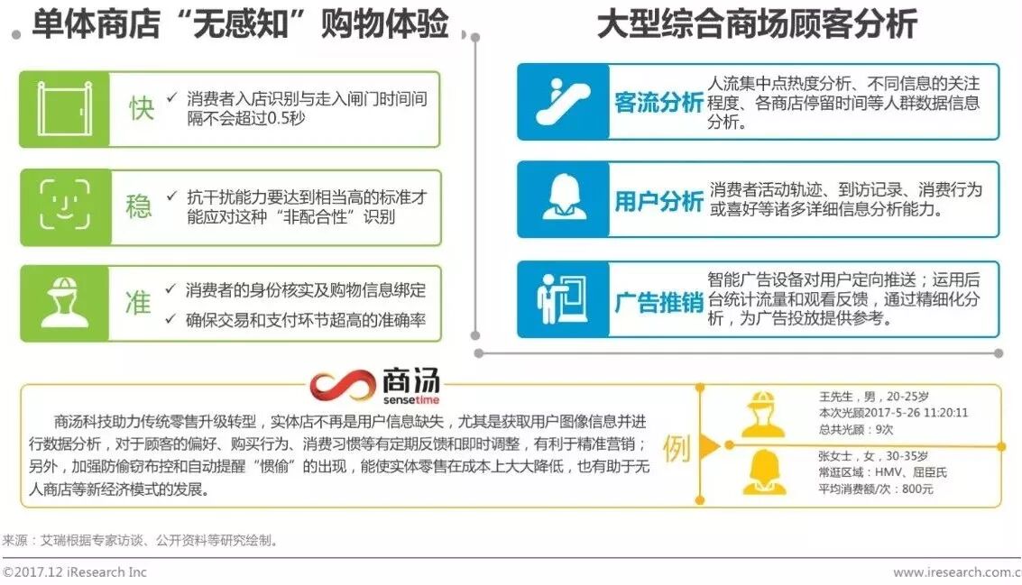 人工智能技術應用為傳統商業提供了基于多維度、精細化數據驅動的運營決策參考,帶來精準營銷、商鋪運營、價值客戶管理、消費大數據運用等諸多技術化、科學化的運營手段。例如:商湯科技的人臉識別技術,實現用戶從刷臉入店到結賬付款僅需“刷臉”一個步驟且行為不需刻意,顧客只要正常出入閘門即可被系統捕捉識別,實現“無感知”進入,大大提升了用戶體驗。