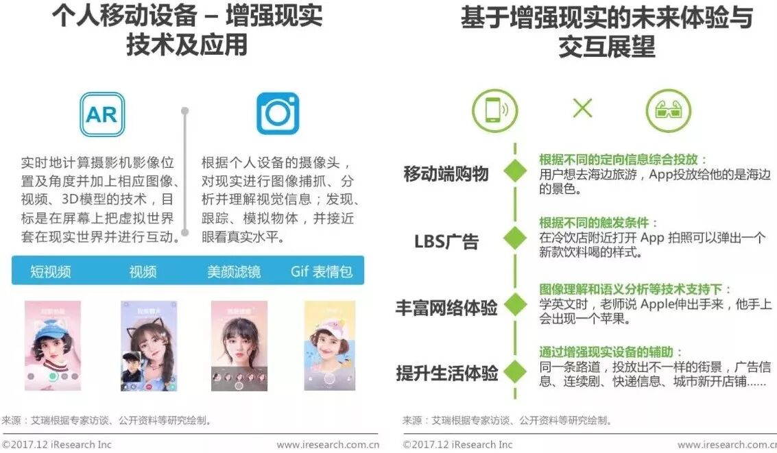 娛樂與生活市場空間較大,我國智能手機用戶對新鮮事物的接受程度較高,并且樂意使用新技術來提升現有產品的體驗,短視頻與美顏濾鏡的瞬間火爆印證了這個觀點。目前,增強現實技術主要應用在個人移動設備上的圖像視頻泛娛樂場景,未來,在硬件設備的升級迭代下,增強現實技術將帶來更廣闊的商業價值。
