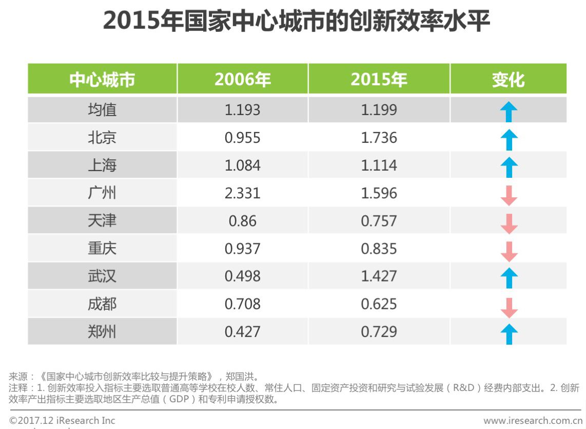 中國的GDP十年來成倍增長,而國家中心城市的整體創新效率提升水平并不顯著。北京、武漢、鄭州較十年前的創新效率水平有明顯提升,其他城市則維持不變甚至有所下滑。可見各大城市目前創新投入和產出都未能跟上經濟發展的步伐,說明經濟結構當中科學技術提升帶來的收益占比低,未來應該重視提高創新效率的投入(人才、資金、技術……),以及重點考察創新帶來的經濟效益。
